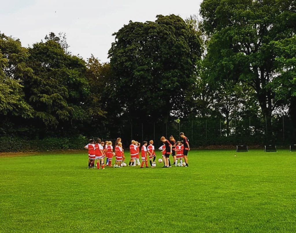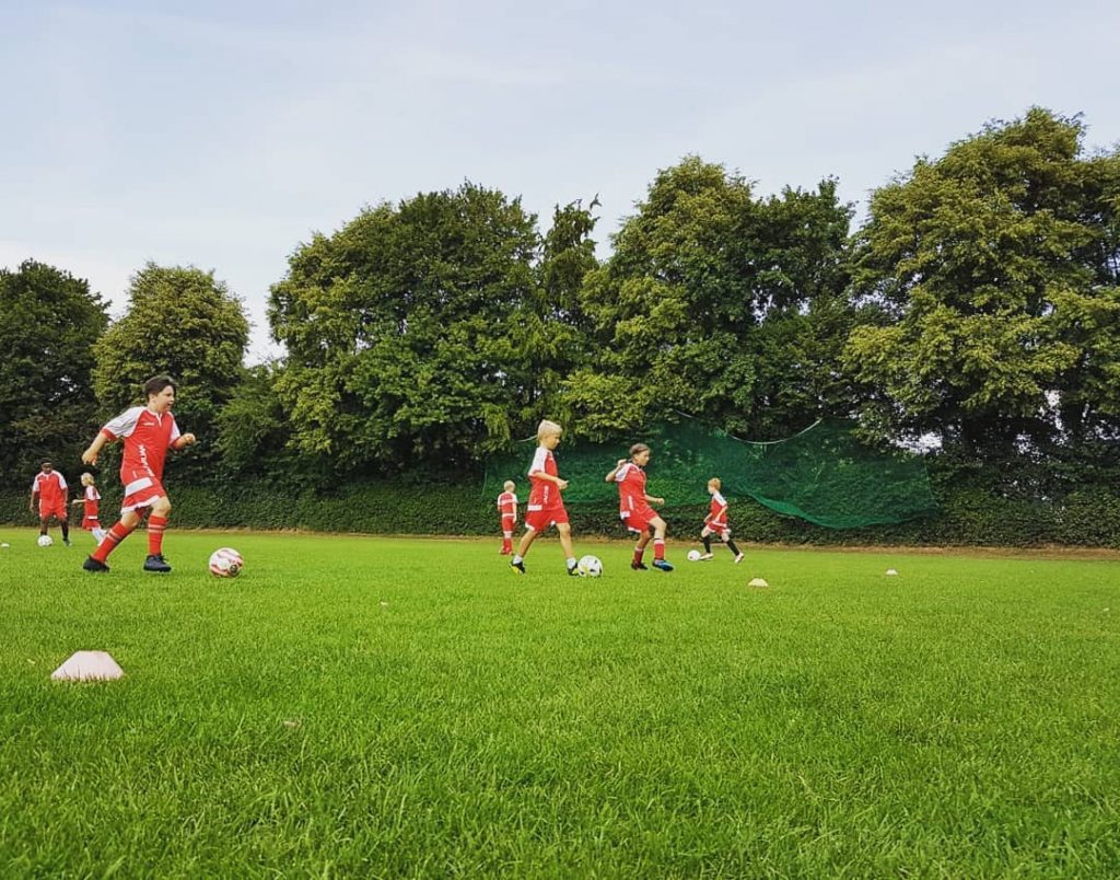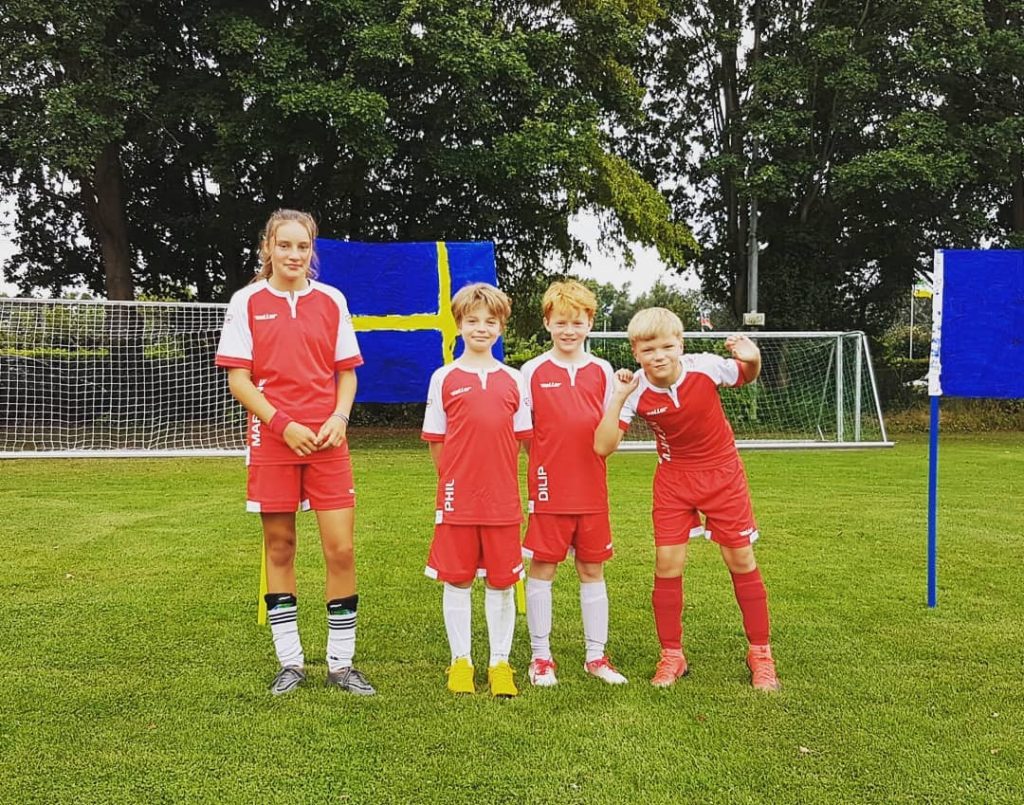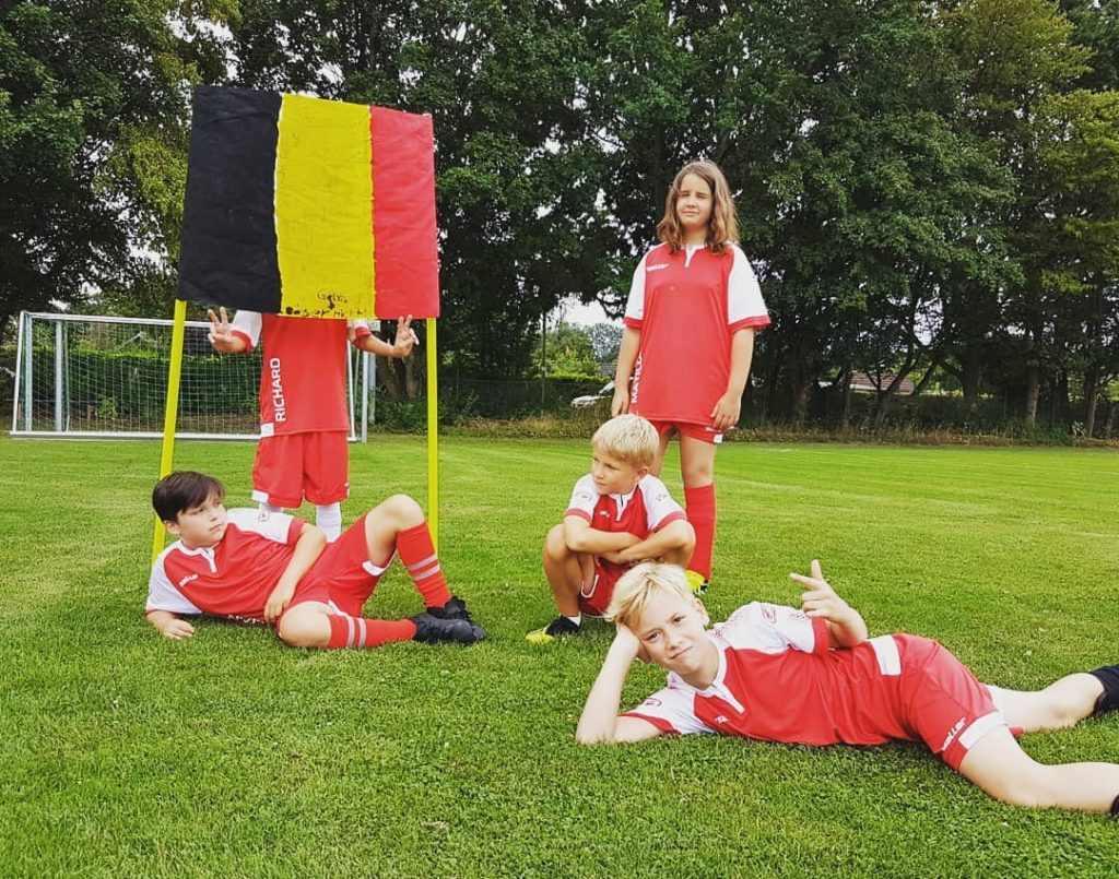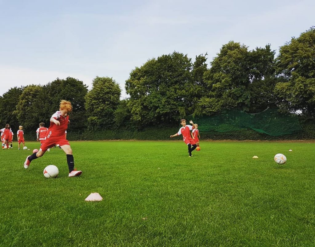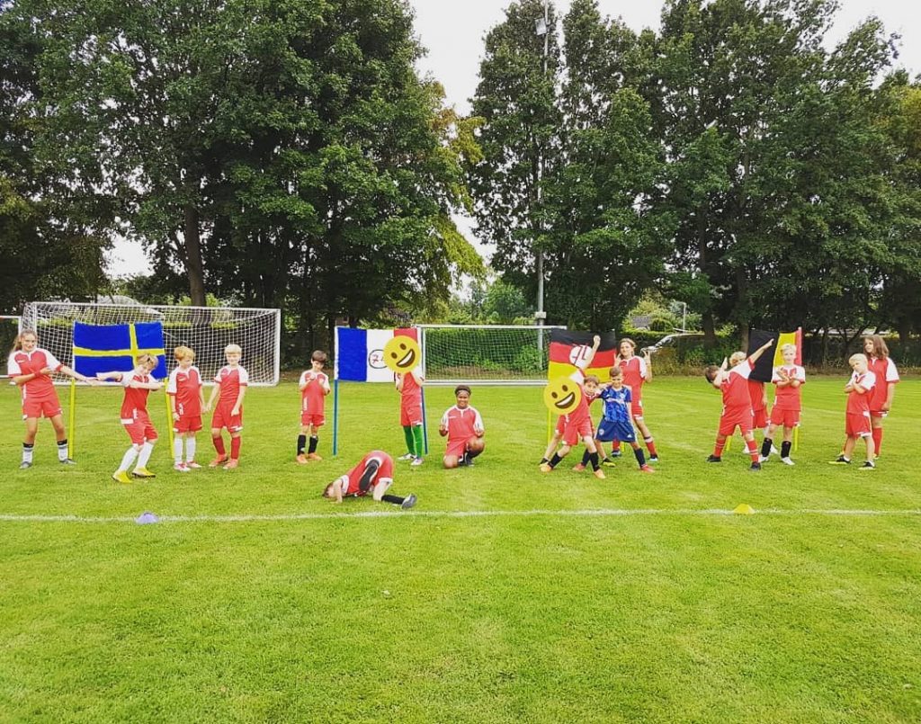 Die diesjährige 74-Ferienschule fand in der letzten Ferienwoche der Sommerferien vom 07.08. bis zum 09.08. statt. Mit dabei waren 18 Mädchen und Jungs zwischen 9 und 12 Jahren, die über die drei Tage von Melanie, Saskia, Jasper und Joris in der Zeit von 10:00 bis 16:00 Uhr betreut wurden. Alle Kinder wurden anfangs mit roten Trikots und Hosen ausgestattet. Auf dem vielseitig ausgewählten Pogramm stand unter anderem das Ausprobieren der neuen “Exerlights”, das spielerische Üben der Techniken, Funino, das große 74-Fußballabzeichen und zum krönenden Abschluss das Spielen einer Mini-WM nach vorherigem Malen der entsprechen Flaggen. Zwischendurch lernte man sich in kleinen Spielen besser kennen und war so den ganzen Tag in Aktion und in Bewegung.