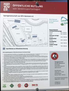 Die Landeshauptstadt Hannover bietet in Zusammenarbeit mit hannoverschen Sportvereinen allen Bürgerinnen und Bürgern zu ausgewiesenen Zeiten die kostenlose Nutzung von Vereins-Sportflächen an. Bis zum 30. September informieren große Schilder am Eingangsbereich der Sportanlagen über die Nutzungsmöglichkeiten.